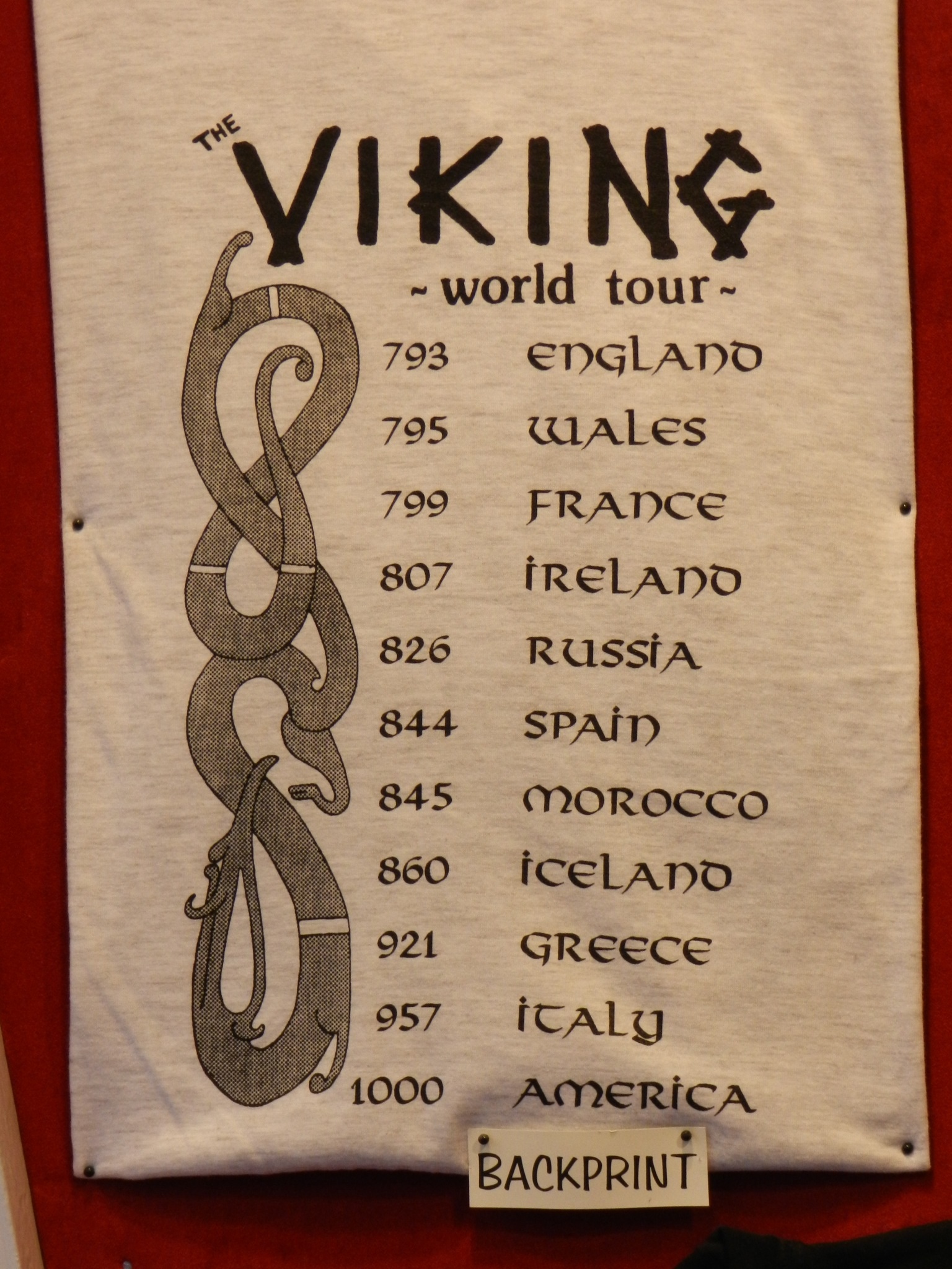 And another with a t-shirt celebrating the first “Viking World Tour: 793 (A.D.) England, 795 Wales…” — glossing over what happened along the way.